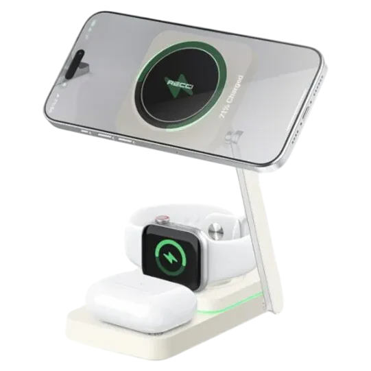 Stay powered up with the Recci RCW-48 Magnetic Wireless Charger – a stylish 3-in-1 charging solution built for your modern lifestyle. Designed to support phones, smartwatches, and wireless earphones simultaneously, this charger is perfect for keeping all your essential devices ready at once.